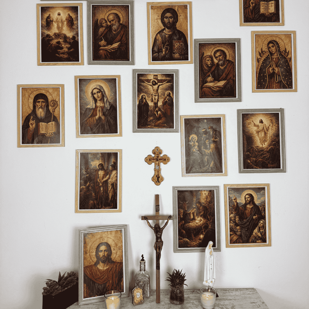 These are sacred prints of conviction designed for men and women who don’t drift, who don’t forget, and who don’t follow trends. Every line, every symbol, every saint and cross is chosen with reverence and meaning.